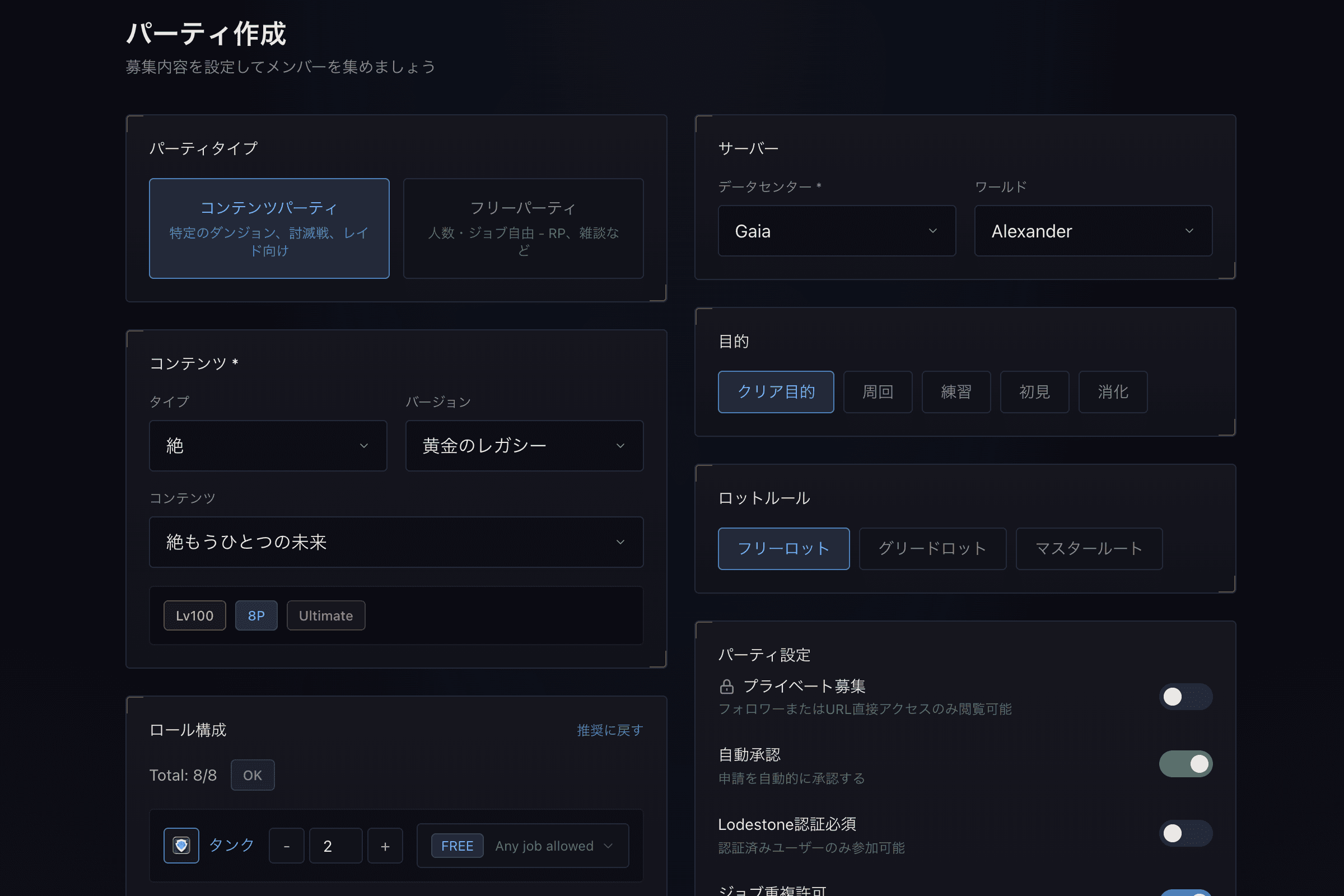 FFXIVのパーティマッチングを支援するサービスです。パーティメンバーを事前に募集し、効率的にコンテンツに挑戦しましょう。